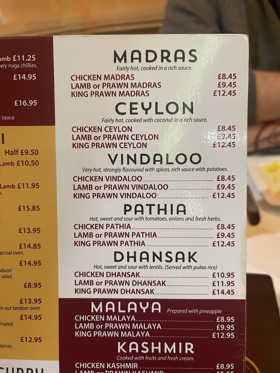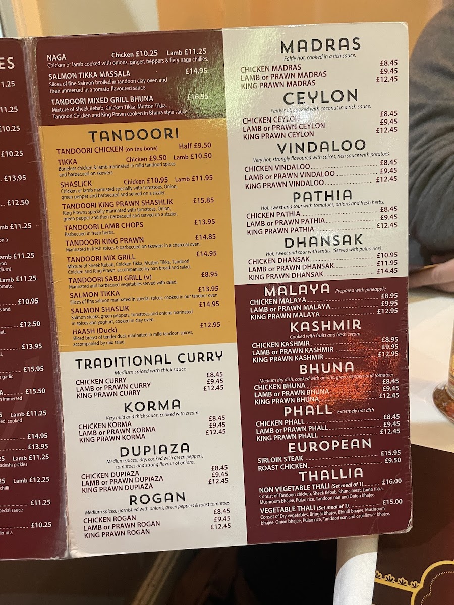 The selection features classic starters like tender Tandoori Mix Kebabs and crisp Onion Bhajees, perfect for sharing or beginning a leisurely meal. Main courses range from mildly spiced options such as Butter Naan and Dal Tadka to more robust dishes like Lamb Bhuna and Madras Chicken, catering well to diners looking for both comforting and vibrant flavors.